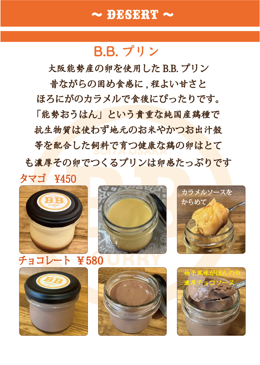 大阪 能勢産の卵を使用したB.B.プリン。昔ながらの固め食感、ほろにがのカラメルで食後にぴったりです。